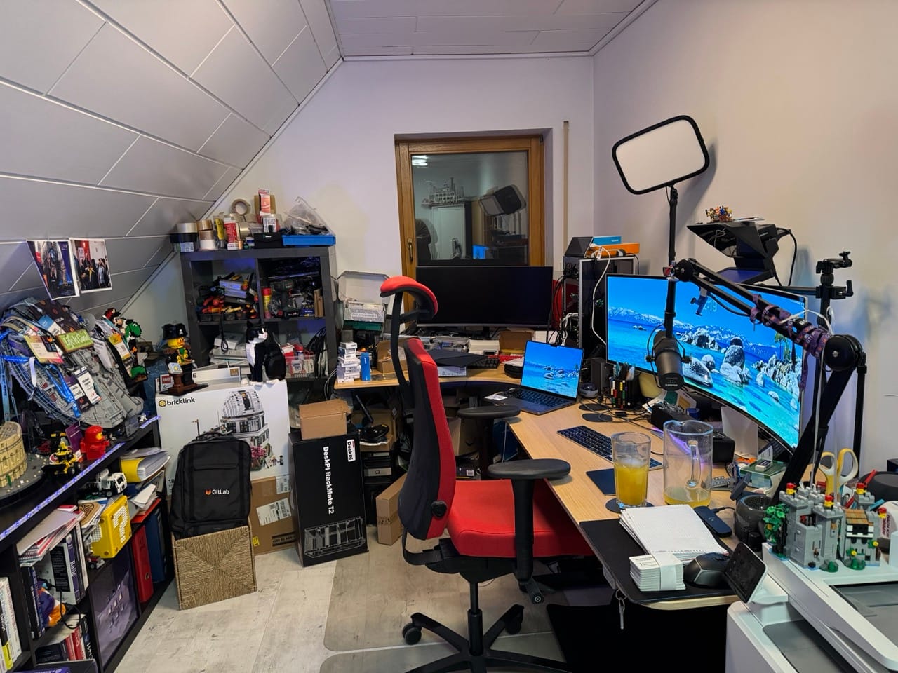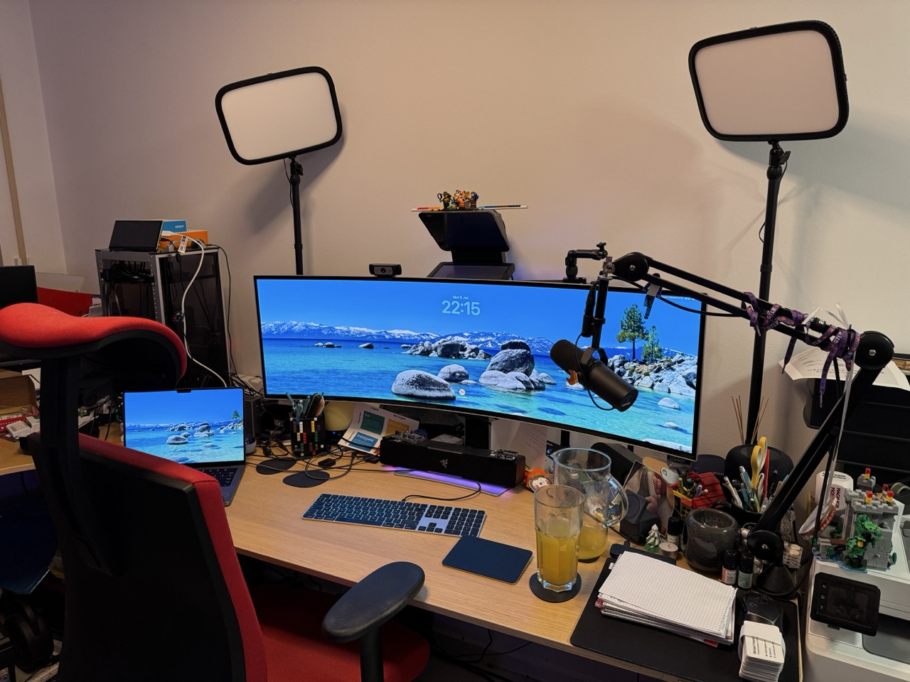 The standing desk, ergonomic chair, and curved monitor reasons are detailed in this blog post from April 2020. In April 2024, I iterated on the setup and added a larger 49" monitor, improved audio/video installation and connection management. Research and setup are explained in this blog post. In late 2024, I had integrated a Gaming PC into the current setup. In 2025, I added a soundbar, and travel packaging tips.